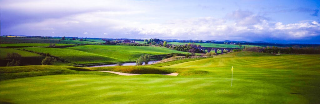 The Roxburghe Hotel and Golf Course in Kelso, Scotland, offers a setting that feels both historic and timeless. The estate grounds stretch across rolling countryside, with the stately hotel anchoring the property and the course weaving naturally through woodlands and fields. But what makes this view especially memorable is the presence of an ancient arched train bridge in the distance — a reminder of Scotland’s layered history that quietly frames the golf experience.